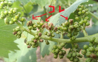 黒土の3年生苗のピオーネに花が付き始めていると夫に教えられ、見てみると本当でした。